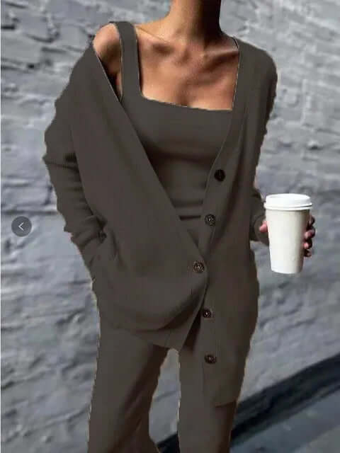 Introducing our Knitted Three-Piece Set: a cozy ensemble designed to elevate your style. Crafted with care for versatile comfort and timeless charm. Stay warm and chic all season long.